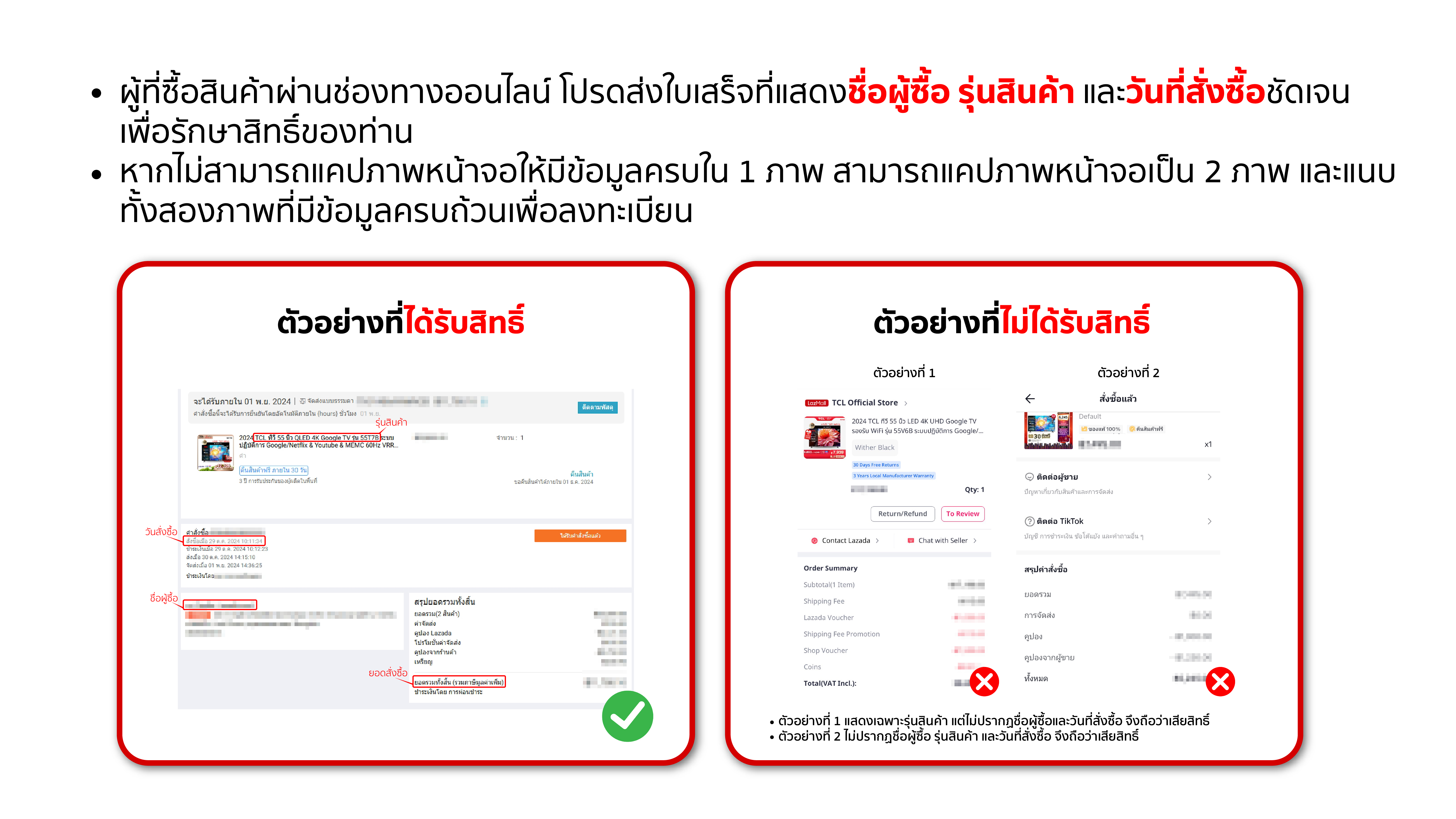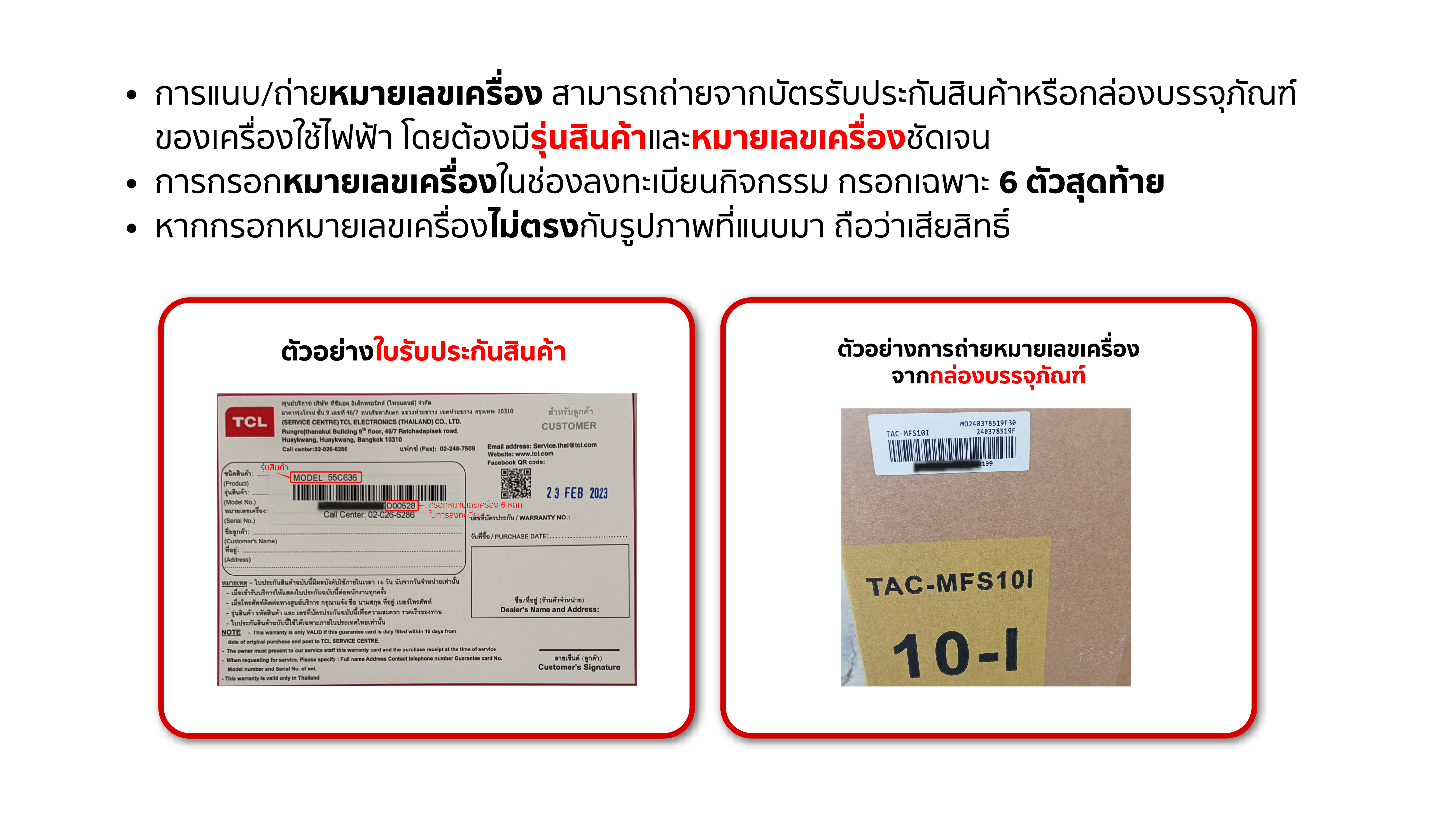 1. ซื้อสินค้าทีซีแอลที่ร่วมรายการ ผ่านร้านค้าสาขา ตัวแทนจำหน่ายหรือช่องทางออนไลน์ของเรา